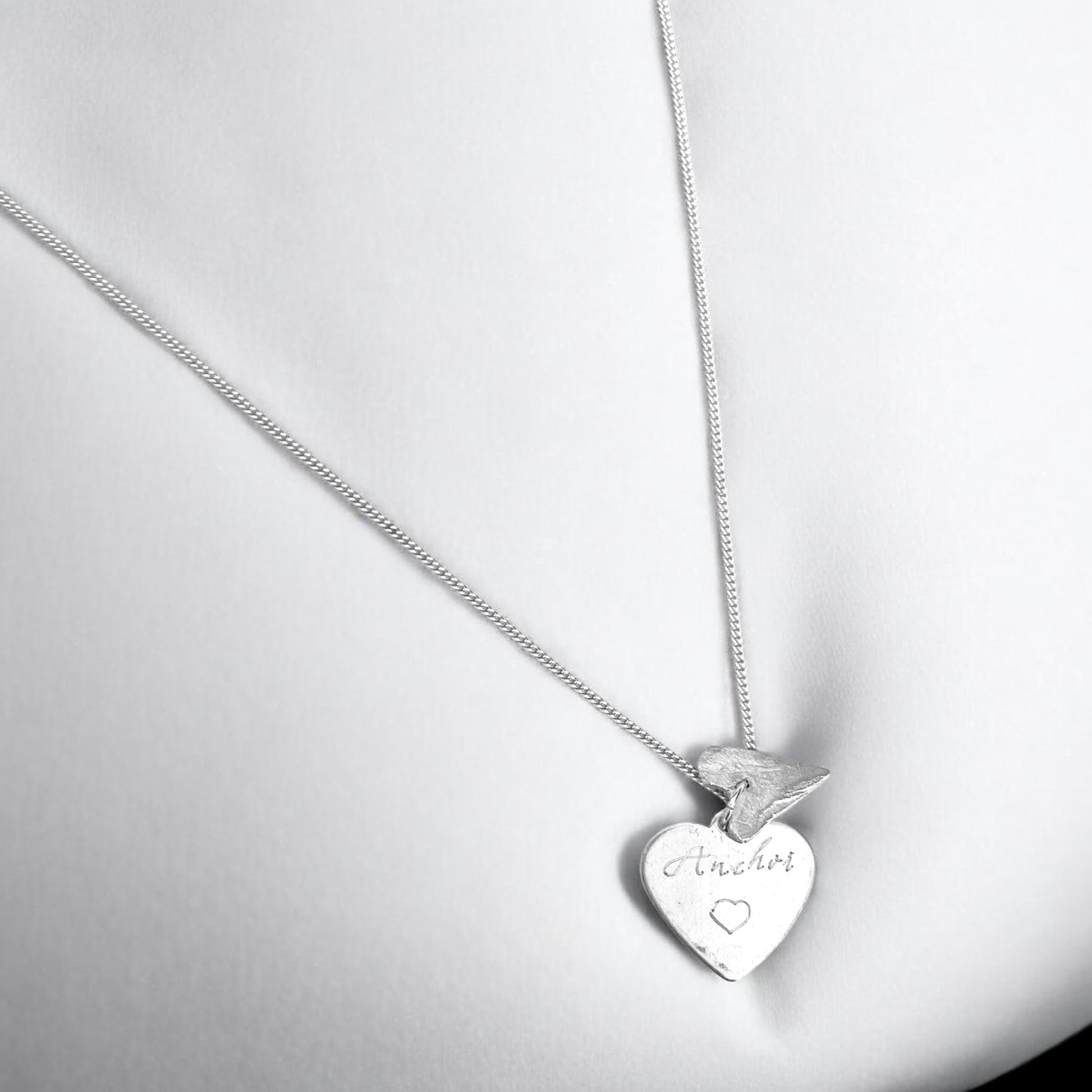 Featuring a V-shaped sterling silver heart with a blend of smooth and rugged texture sitting atop an engraved heart inscribed Anchor. Suspended on a fine sterling silver curb chain, this necklace is a reminder that love can steady, guide, and hold us firm.