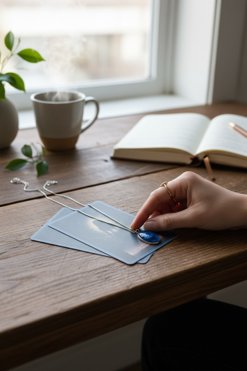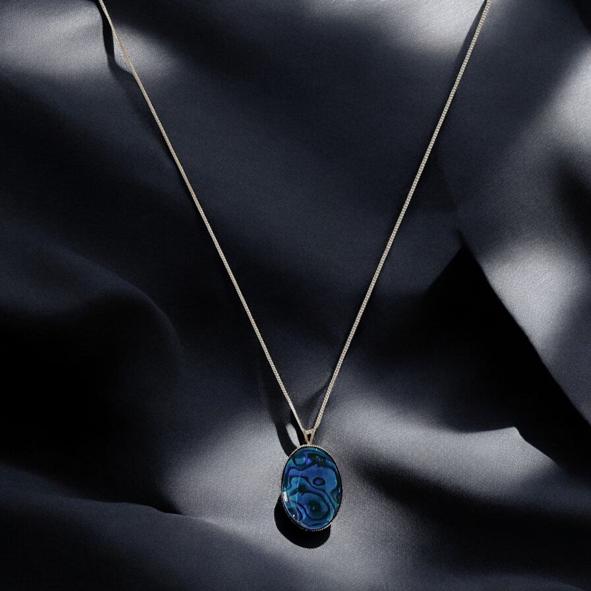 Its fine chain holds a luminous oval blue abalone pendant in a sterling silver setting, symbolising emotional balance, intuition, and the rare beauty that emerges through change. Simple yet striking, this piece invites the wearer to embrace transformation with calm and clarity.