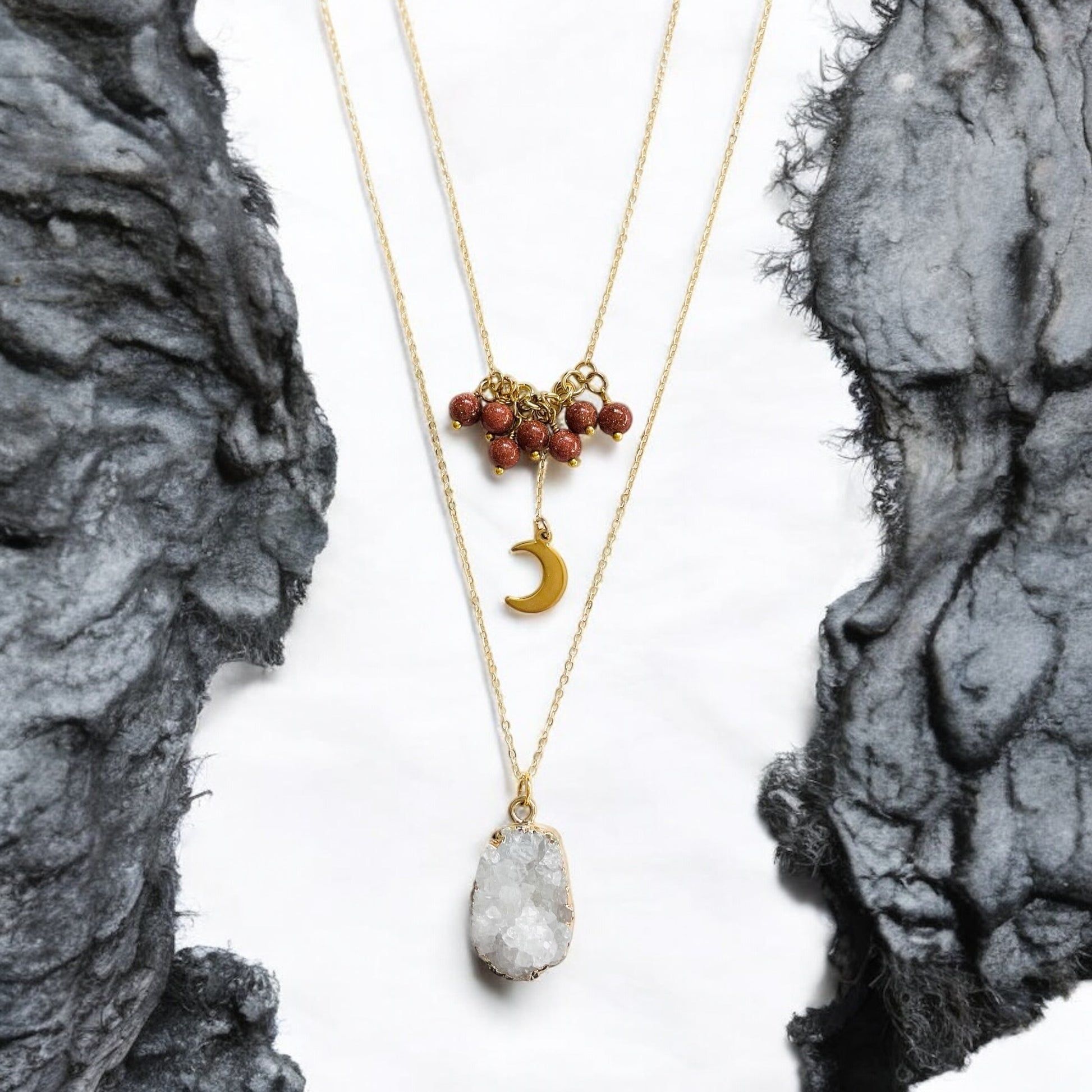One necklace holds a striking quartz crystal pendant, symbolising clarity within mystery, while the other layers a cluster of glittering goldstone beads - a talisman of courage and ambition. From its centre drops a delicate chain with a moon charm, reminding the wearer of comfort in life's unseen phases.