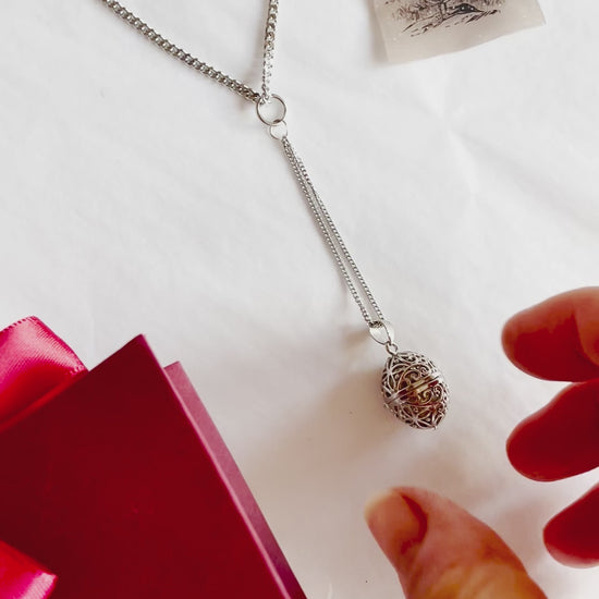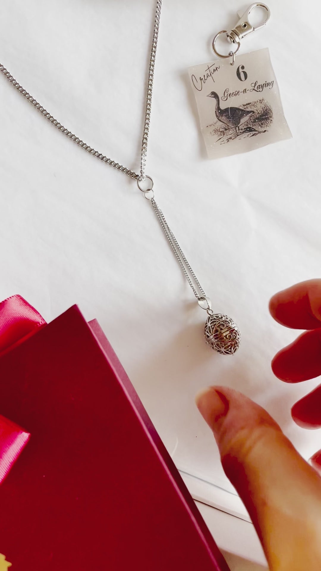 Featuring a medium-thick stainless steel curb chain with a graceful lariat-style drop. Suspended from the drop is a Tibetan style filigree egg cage pendant, complete with a functioning clasp so you can gently open it by hand. Inside the cage rests a large imitation pearl 'egg', surrounded by miniature pearls that have been carefully wired into place - a delicate nod to the idea of new beginnings, nurture, and the symbolic eggs of 'Six Geese A-Laying.