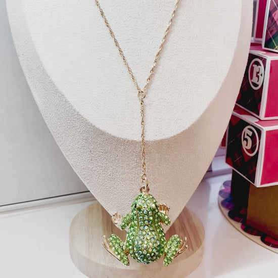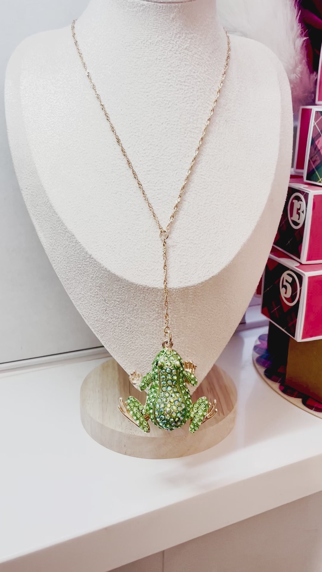 Suspended from a gold stainless steel Singapore chain, the Y-shaped design drops elegantly from a central jump ring, allowing the generously sized frog to rest playfully at the chest - bold, joyful, and unapologetically eye-catching.